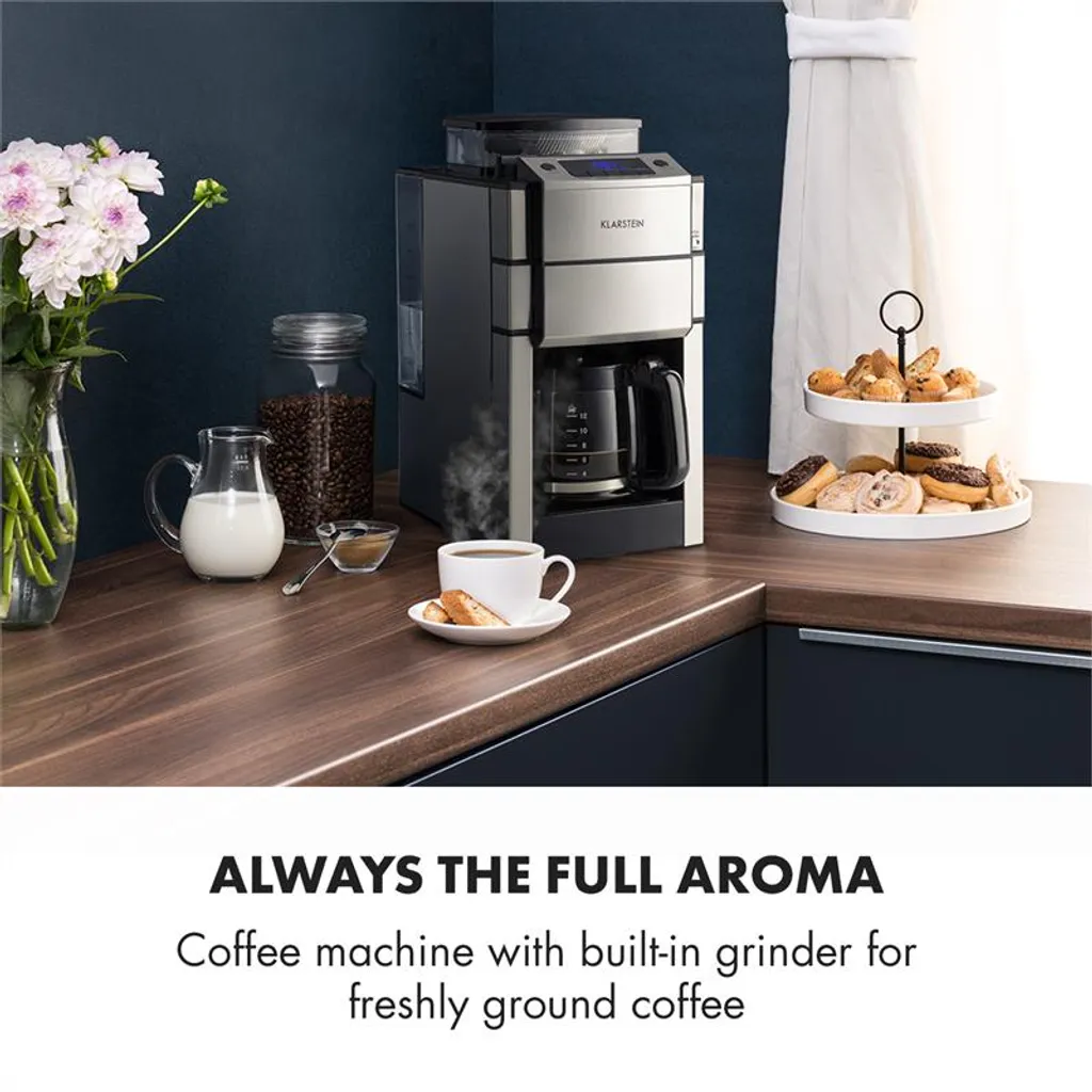 VOLLES AROMA: Kaffeegenuss neu entdecken – die Klarstein Aromatica X Kaffeemaschine macht’s möglich: Dank ihrem integrierten Mahlwerk werden bis zu 180 g Bohnen für jeden Brühvorgang frisch gemahlen – so enthält das Kaffeepulver immer das volle Aroma.INDIVIDUELL: Dank wählbarer 3 Mahlgrade von sehr fein bis grob hat man die Möglichkeit die Stärke anzupassen. Je feiner das Pulver, desto stärker der Kaffee. Außerdem steht die Aroma + -Funktion zur Verfügung: doppelte Brühzeit für das Maximum an Kaffeearomen.TIMER-FUNKTION: Durch den integrierten Timer kann die Klarstein Aromatica X Kaffeemaschine problemlos zum minutengenau festgelegten Zeitpunkt starten – so wird man morgens von frischem Kaffeeduft geweckt oder kehrt abends zu einer aromatischen Stärkung heim.LED-DISPLAY: Alle Einstellungen am kompakten Edelstahl-Designgerät im futuristisch-schlichten Look werden ganz unkompliziert am selbsterklärenden Bedienfeld mit LED-Display vorgenommen.HOHE QUALITÄT: Der herausnehmbare Permanentfilter gibt dank Goldbeschichtung keine Aromen an den Kaffee ab. Ein Aktivkohle-Filter im Wassertank erhöht zudem die Wasserqualität und schützt das Gerät vor lästigen Verkalkungen.