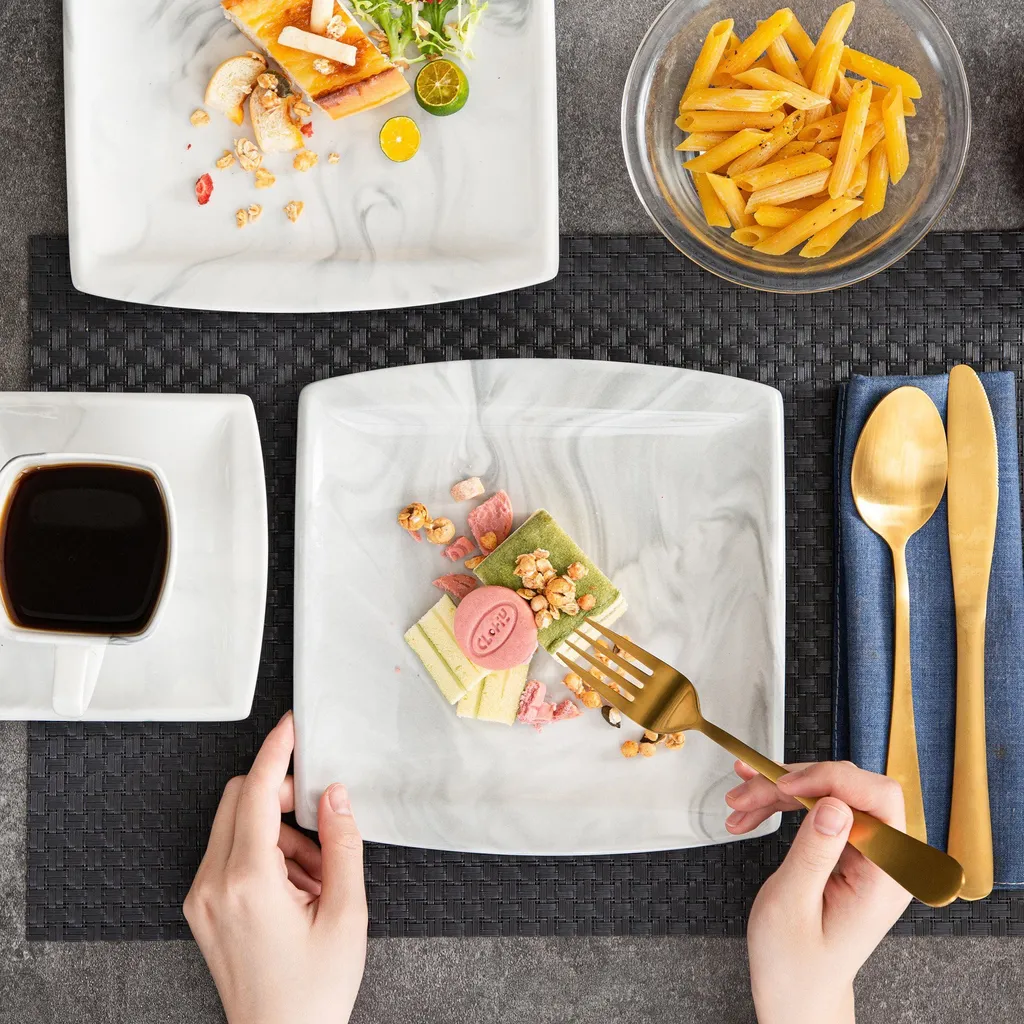 - SCHÖNES KAFFEESET AUS HOCHWERTIGEM PORZELLAN IN MARMOR | Handgefertige Porzellanprodukte mit sehr schöner hochwertiger Optik, beinhaltet 8,25″ Dessertteller (12 teiligen) 21 x 21 x 2,5 cm, 4″ Tasse (12 teiligen) 10 x 7 x 8 cm mit 5,5″ Untertasse (12 teiligen) 14 x 14 x 2 cm.