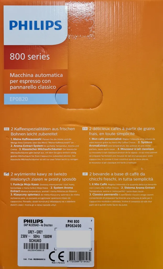 Philips EP0824/00 Kaffeevollautomat 800 Series mit klassischem Milchaufschäumer – Grau