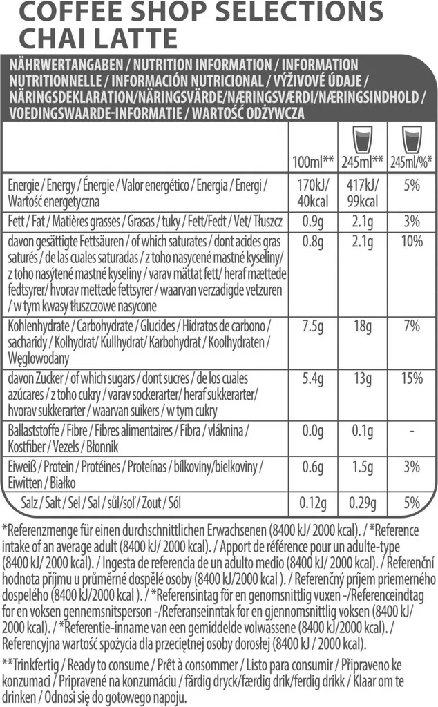 - Zutaten: Zucker, Glucosesirup, MAGERMILCHPULVER (15%), Kokosfett (ganz gehärtet), Tee-Extrakt (2,5%), Aromen, Salz, MILCHPROTEINE, Stabilisatoren (E340), Trennmittel (E341)