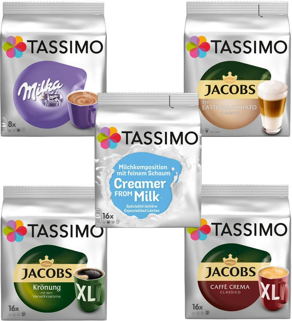 TASSIMO Creamy- Kaffee Paket Jacobs Krönung Crema Milka 5 Packungen 64 Portionen